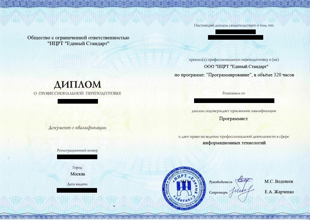 • Диплом о профессиональной переподготовке установленного государством образца. Срок действия: бессрочно