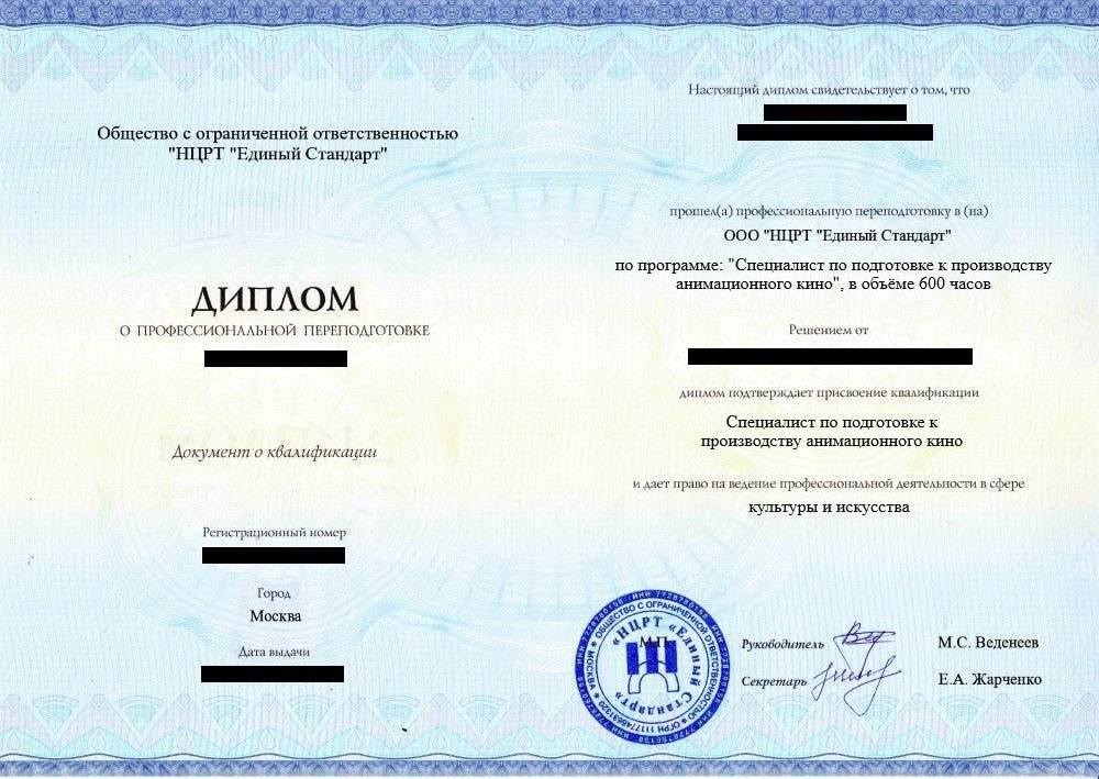 • «Специалист по подготовке к производству анимационного кино» с правом ведения профессиональной деятельности в сфере культуры и искусства